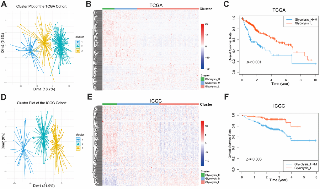 We additionally extracted and analyzed the gene expression profiles of 288 glycolysis-associated genes from the LIRI-JP dataset in ICGC. Here as well, patients with HCC could be classified into three distinct glycolysis subgroups (Figure 1D, 1E). Further, the Kaplan–Meier plot showed a significant difference (p = 0.003) in the OS between the different glycolysis subgroups in the ICGC cohort as well (Figure 1F).