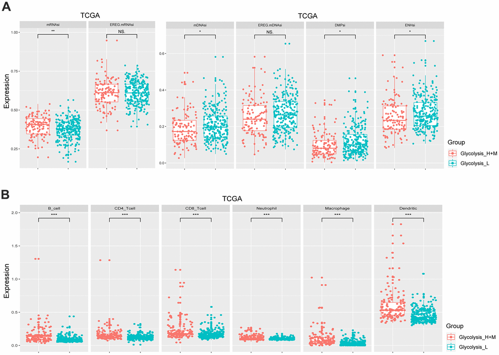 mRNAsi and mDNAsi are the two main indices that reflect the stemness of samples based on gene expression and epigenetic features, respectively [10]. As shown in Figure 2A, the Glycolysis-H+M subgroup had a significantly higher stemness index in mRNAsi (p < 0.01) and, a lower epigenetic level (p < 0.05). The regulatory network of stem cell index and glycolysis-associated genes showed that mRNAsi negatively regulated PFKFB3 and VCAN, while it positively regulated CENPA. Further, mDNAsi negatively regulated QSX1, GPC4, and TGFA (Supplementary Figure 2A).