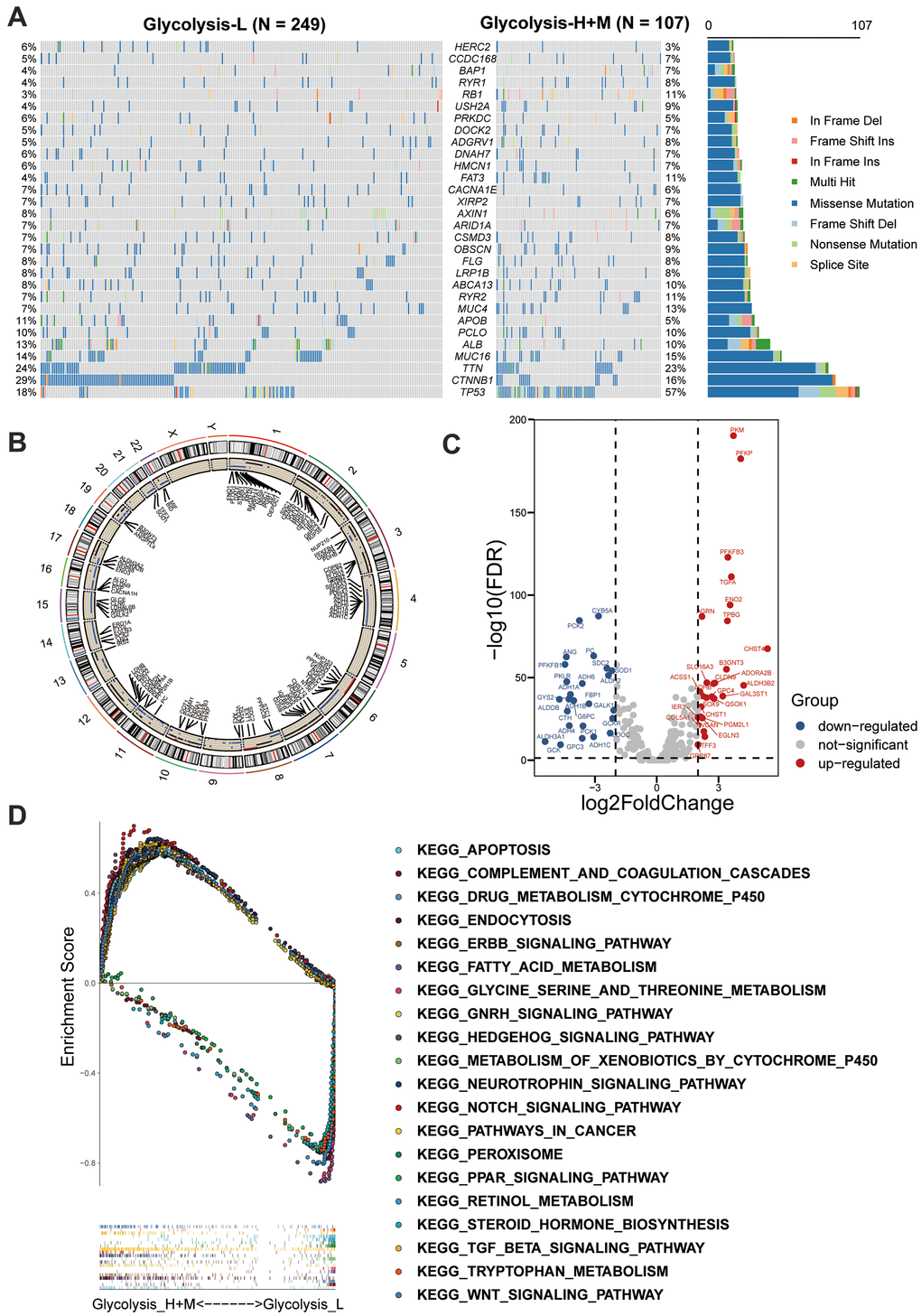 Mutation data of patients with HCC from TCGA were analyzed and visualized using maftools package in R software [36]. Genes with the highest tumor mutation frequencies and their percentages in different glycolysis-associated subgroups were displayed using a waterfall plot. Chi-square test was employed to screen significantly different CNVs (adjusted p < 0.05) among the different glycolysis-associated subgroups.