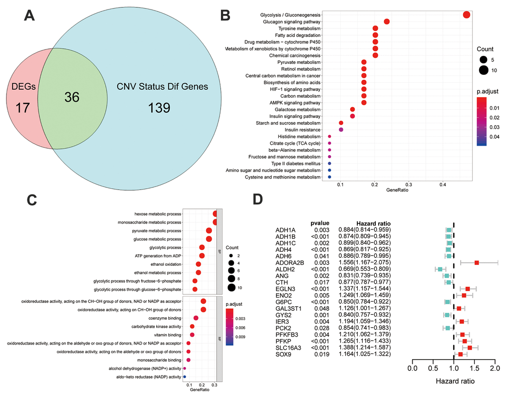 Genes with different expression levels and CNV statuses were obtained by taking the intersection of the DEGs and genes with different CNV statuses among the different glycolysis-associated subgroups. These genes were subjected to gene ontology (GO) and pathway analyses. For the GO analysis, we identified enriched terms related to biological processes (BP), molecular functions (MF), and cell components (CC). Terms with FDR < 0.05 in GO and pathway analyses were visualized [40]. Furthermore, we conducted a univariable Cox regression analysis to evaluate the correlation of the expression levels of these genes and OS of the patients with HCC.