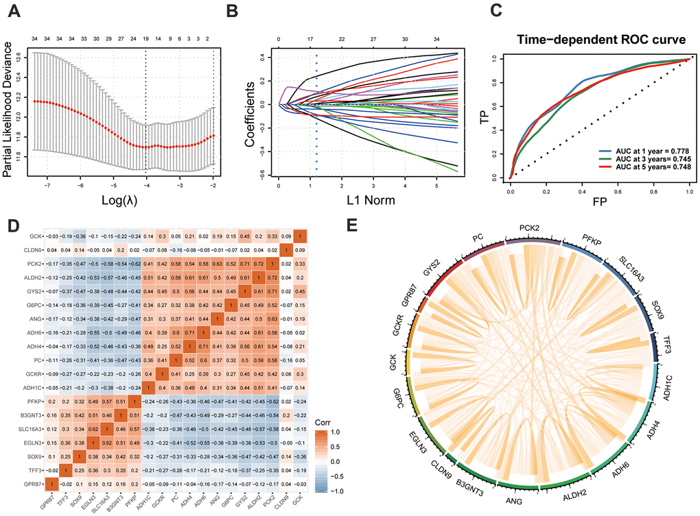 A least absolute shrinkage and selection operator (LASSO) regression model was used to extract key glycolysis-associated genes based on the DEGs and CNV statuses to construct a glycolysis-associated multiomics prognostic model (GMPM) using glmnet R package [41]. Next, the risk score of each patient with HCC in TCGA and ICGC was calculated by adding the multiplication of each glycolysis-associated gene expression level with its corresponding regression coefficients. Correlation analysis between key glycolysis-associated genes was further conducted.