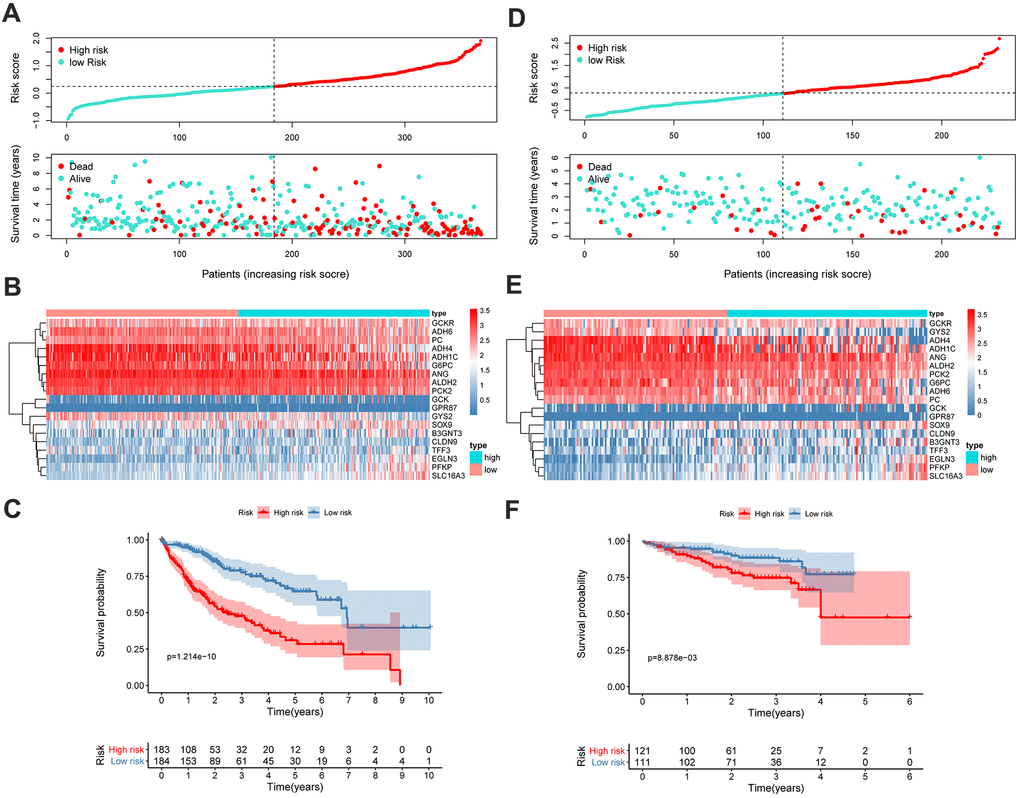 Using the GMPM signature and formula, the risk score of each patient in TCGA cohort was calculated. The coefficients of each gene in the GMPM are listed in Table 2. We used the median value (median = 0.28) of the risk score as the cutoff level to categorize the patients with HCC into high- and low-risk groups (Figure 6A). The relationship between the risk scores and OS was investigated, and the results indicated that patients in the high-risk group had a worse survival than those in the low-risk group (Figure 6C). The expression levels of GCKR, ADH6, PC, ADH4, ADH1C, G6PC, ANG, ALDH2, and PCK2 were downregulated and those of GCK, GPR87, GYS2, SOX9, B3GNT3, CLDN9, TFF3, EGLN3, PFKP, and SLC16A3 were upregulated in the high-risk group (Figure 6B).
