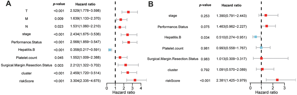 To investigate whether the GMPM risk score was an independent risk factor for HCC prognosis prediction, we conducted univariable and multivariable Cox regression analyses. The results of the univariable analysis showed a significant hazard ratio of tumor stage, ECOG performance status, HBV infection status, platelet count, surgical margin status in resection, cluster and riskscore in the OS of patients with HCC (p < 0.05; Figure 7A). Furthermore, multivariable analysis demonstrated that GMPM and HBV infection status was an independent predictive factor of OS in HCC (p < 0.001; Figure 7B). These results further confirmed the prognostic potential of the GMPM signature in predicting OS in patients with HCC.