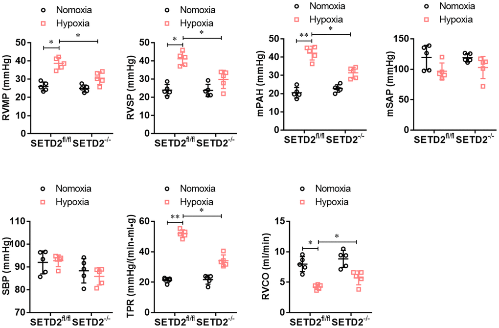 To explore the role of SETD2 in the vascular remodeling during PAH, we constructed a C57BL/6 mouse with specific knockout of SETD2 in SMCs (SETD2SM22a-Cre C57BL/6 mice) (Figure 1A). The deleted expression of SETD2 in SMCs was confirmed by Western blotting (Figure 1B). Next, SETD2SM22a-Cre mice and SETD2fl/fl mice were subjected to induction of PAH under normobaric normoxic or hypoxic conditions (10% O2) for 28 days, respectively. After 28 days of hypoxic exposure, hypoxia significantly increased RVMP, RVSP, mPAP, TPR, and PAMT, compared with normoxic group, whereas RVCO in hypoxia treated groups was dramatically reduced (Figure 2). There were no significant differences in SBP and mSAP between hypoxic and normoxic groups (Figure 2). However, the mean of RVMP, RVSP, mPAP, TPR and PAMT were significantly lower in SETD2SM22a-Cre mice than that in SETD2fl/fl mice after hypoxic exposure (Figure 2). Furthermore, SETD2 deficiency in SMCs led to significant increases in RVCO in SETD2SM22a-Cre mice compared with SETD2fl/fl mice (Figure 2). Collectively, these data suggest that SETD2 deficiency in SMCs ameliorates PAH in hypoxia-induced mouse PAH model.