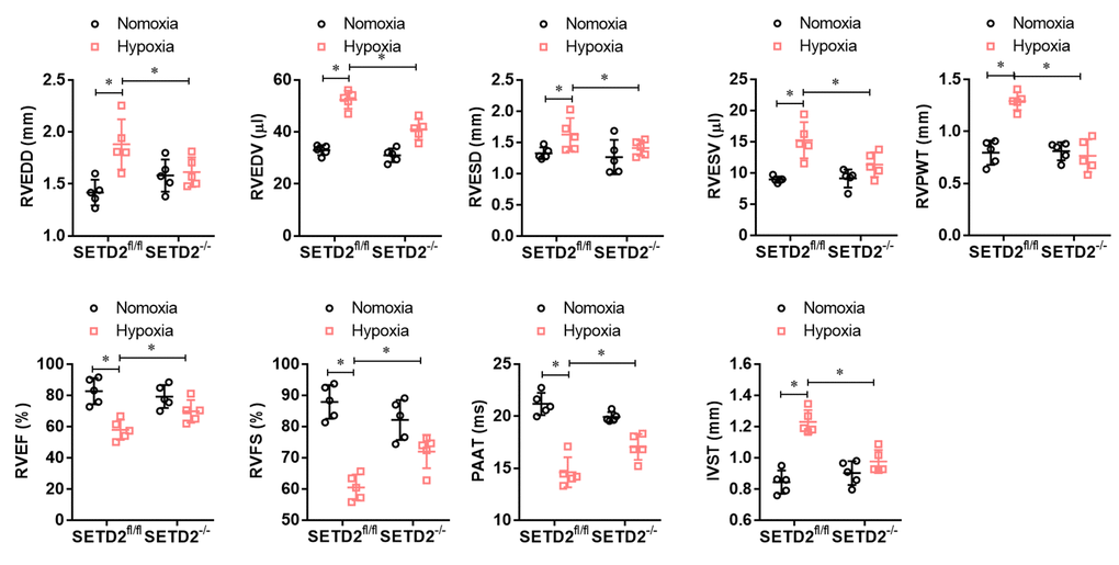 To explore whether SMCs specific SETD2 deficient ameliorates right ventricular dysfunction in mouse PAH model, we performed echocardiography. As shown in Figure 3, hypoxia significantly increased RVEDD, RVEDV, RVESD, RVESV, RVPWT and IVST and significantly decreased RVEF, RVFS and PAAT/CL compared with normoxic group. Consistently, SMCs specific SETD2 deficient obviously reduced RVEDD, RVEDV, RVESD, RVESV, RVPWT and IVST, and enhanced RVEF, RVFS and PAAT/CL compared with SETD2fl/fl mice in hypoxia group. These data indicate that hypoxia-induced PAH mice develop significant right ventricular dysfunction, which could be ameliorated by SMCs specific SETD2 deficient.