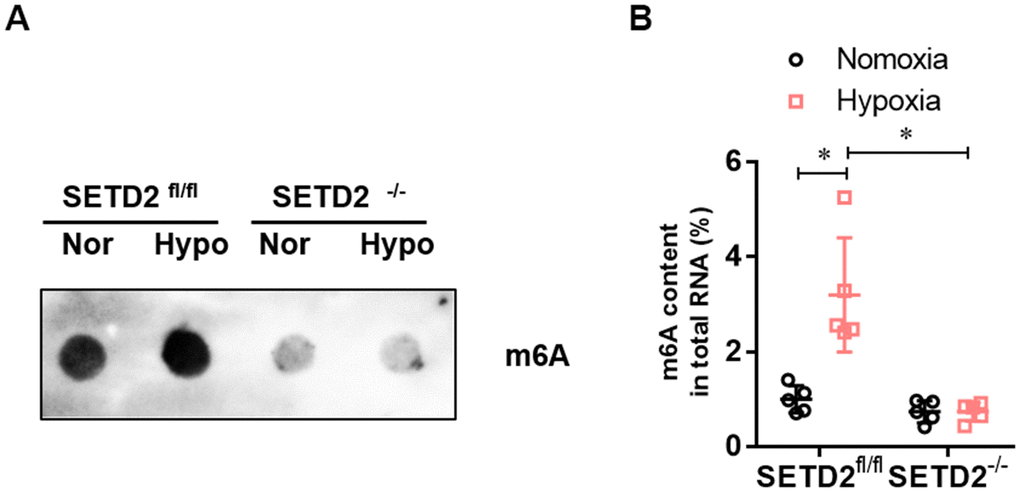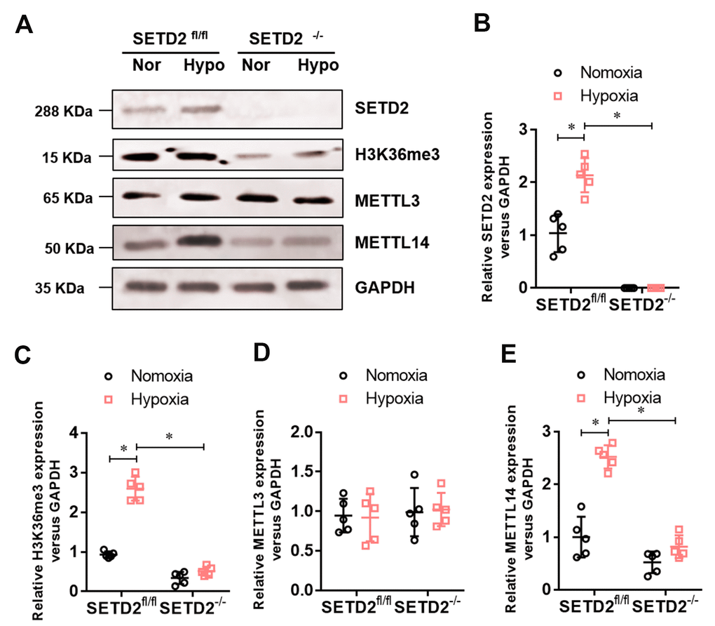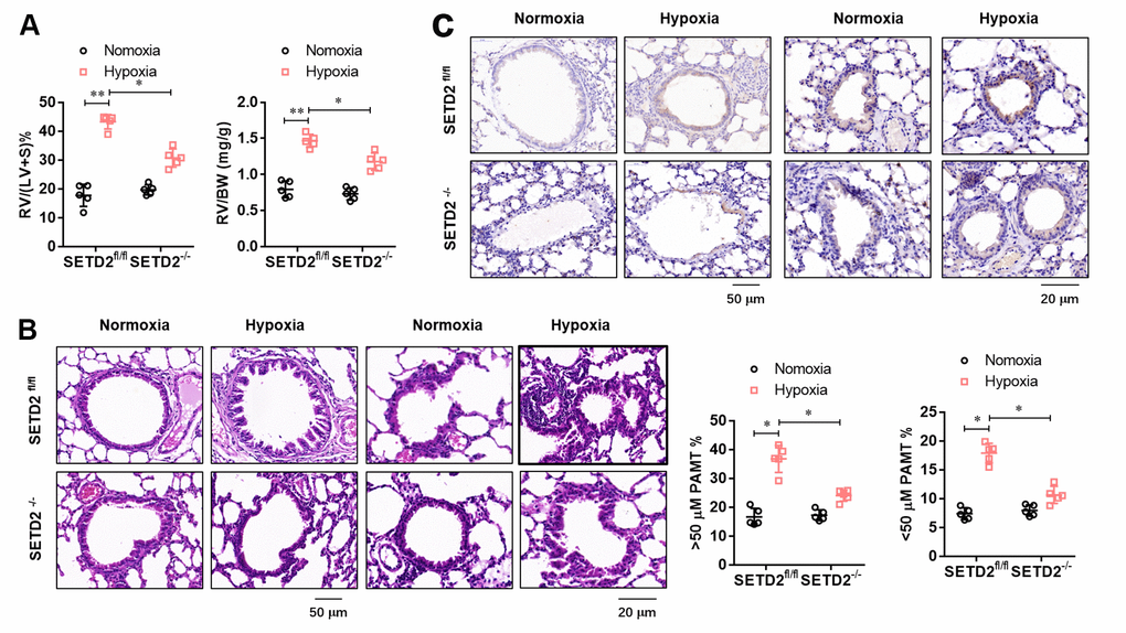 At the age of 10–12 weeks, male SETD2SM22a-Cre mice and their WT littermates (SETD2fl/fl) were randomly assigned to the normoxia group (N) and hypoxia group (H). The normoxia group was exposed to room air, whereas the hypoxia-group mice were placed in a ventilated chamber with 10% O2 and CO2 < 0.5% environment. The environment was established by a mixture of room air and nitrogen with a detector (RCI Hudson, Anaheim, CA, USA) which monitored and controlled the fractional concentration of O2 automatically.