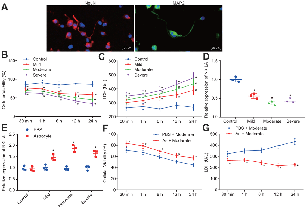 Astrocytes have been previously reported to secrete a variety of substances to protect the CNS [22]. To characterize the protective effect of astrocytes on neurons, a mechanical injury model of human neurons was constructed in vitro. Initially, we identified the human neurons with immunofluorescence, revealing that the neurons expressed microtubule-associated protein 2 (MAP2) and neuron-specific protein (NeuN) (Figure 1A). Thereafter, the proliferation in neurons were strikingly decreased in mild, moderate or severe injury, shortly after 30 min injury, peaking at 24 h, and cell viability decreased with the severity of injury (p < 0.05; Figure 1B). In addition, lactate dehydrogenase (LDH) content was significantly higher in injured neurons compared to control neurons 30 min post-injury (p < 0.05; Figure 1C). Moreover, the reverse transcription-quantitative polymerase chain reaction (RT-qPCR) results confirmed that NKILA expression was downregulated in injured neurons (Figure 1D), while the co-culture of astrocytes upregulated NKILA expression in injured neurons (Figure 1E). Meanwhile, when compared to the injured neurons culture, the cell viability was increased (Figure 1F) while LDH content (Figure 1G) was decreased in injured neurons co-cultured with astrocytes (p < 0.05). These results demonstrate that the stimulated NKILA expression accelerates the recovery of injured neurons.