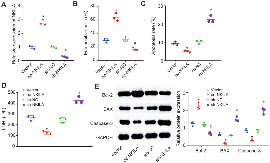 To further characterize the recovery effect of NKILA overexpression in injured neurons, NKILA were upregulated and silenced in injured neurons (Figure 2A). Then, EdU assay, propidium iodide (PI) and Annexin labeling and quantification were conducted to measure the neuronal proliferation and apoptosis. When compared with neurons treated with vector, an increase in the proliferation and LDH content and a reduction in apoptosis were observed in neurons overexpressing NKILA (p < 0.05; Figure 2B–2D). Meanwhile, Western blot analysis revealed that the expression of anti-apoptotic gene (Bcl-2) was significantly higher, while the expression of pro-apoptotic genes [Bcl-2-Associated X (Bax) and Caspase-3] was significantly lower in overexpressing (oe) NKILA-treated neurons when compared with vector-treated neurons (p < 0.05; Figure 2E). However, these results were completely opposite in short hairpin (sh)-NKILA-treated neurons versus sh-NC-treated neurons. Taken together, the upregulation of NKILA promotes the functional recovery of injured neurons.