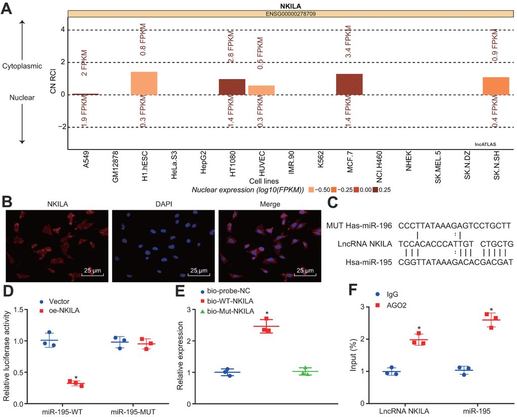 The NKILA subcellular location was predicted using the lncATLAS website, which demonstrated that NKILA was located in the cytoplasm (Figure 3A). Then, the result of fluorescence in situ hybridization (FISH) assay further substantiated that NKILA was located in the cytoplasm of neurons (Figure 3B). Meanwhile, the RNA22 website predicted binding sites between NKILA and miR-195 (Figure 3C). Dual-luciferase reporter gene assay further validated that when compared with the treatment of vector, the luciferase activity of miR-195-wild type (WT) was inhibited by the treatment of oe-NKILA (p < 0.05), while no obvious change of luciferase activity of miR-195-mutated (MUT) was observed (p > 0.05; Figure 3D), suggesting that NKILA could competitively bind to miR-195. Additionally, RNA pull-down displayed that compared with the treatment of Bio-probe NC, the enrichment of miR-195 remained unchanged following the treatment of Bio-MUT-NKILA (p > 0.05), but was significantly increased after the treatment of Bio-WT-NKILA (p < 0.05; Figure 3E), indicating that Bio-Wt-NKILA could promote the enrichment of miR-195. As depicted in Figure 3F, when compared with immunoglobulin G (IgG), the binding of NKILA and miR-195 to AGO2 were increased significantly (p < 0.05), suggesting that NKILA could bind to AGO2 protein and miR-195. Based on the aforementioned results, NKILA competitively binds to miR-195.