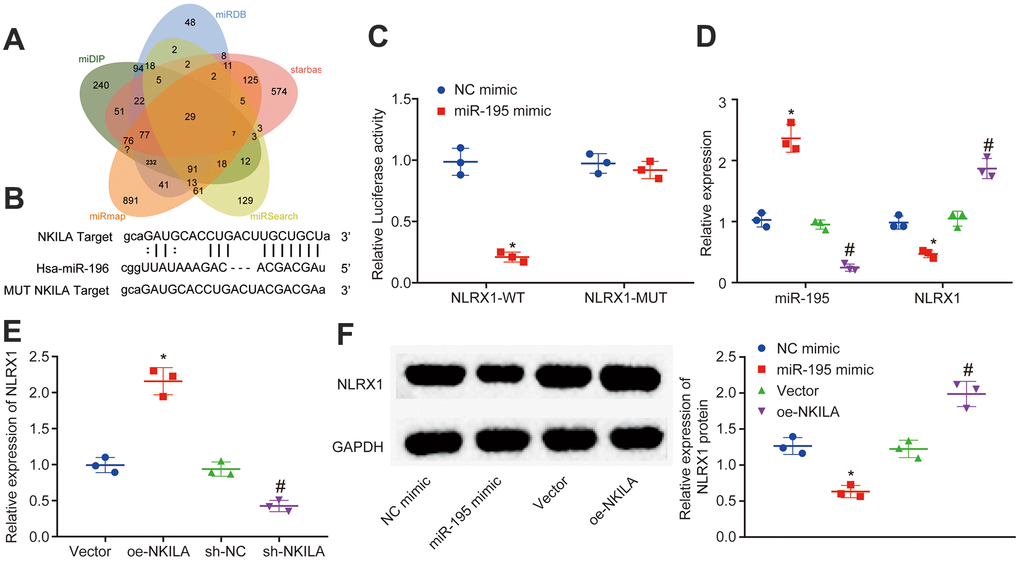 To identify the downstream mechanism of NKILA, the predicted target genes of miR-195 in miDIP, miRDB and starbase were intersected, where 29 intersected target genes were obtained (Figure 4A). Among these intersected genes, the loss of NLRX1 has been reported to aggravate the neurological injury and NF-κB signal after brain injury [23]. However, the mechanism of NLRX1 expression regulated by NKILA-mediated miR-195 to protect neurons from TBI remains undiscovered. Therefore, NLRX1 was selected as a candidate target gene. Based on RNA22 website, there were putative binding sites between NLRX1 and miR-195 (Figure 4B). Moreover, dual-luciferase reporter gene assay demonstrated that when compared with the treatment of NC mimic, the luciferase activity of NLRX1-3'UTR-WT was decreased by the treatment of miR-195 mimic (p < 0.05), while no obvious change of luciferase activity was observed in NLRX1-3'UTR-MUT (p > 0.05; Figure 4C), suggesting that miR-195 could target and negatively regulate NLRX1. The result of RT-qPCR revealed that the treatment of miR-195 mimic increased the miR-195 expression and decreased the NLRX1 expression, while the treatment of miR-195 inhibitor induced the opposite trends (Figure 4D). Meanwhile, RT-qPCR also demonstrated that NLRX1 expression was significantly increased after NKILA overexpression, but significantly decreased following NKILA inhibition (Figure 4E). Western blot analysis was performed to determine the NLRX1 protein expression. The results revealed that the protein expression after treatment of miR-195 mimic in NLRX1 was decreased, but increased in NLRX1 protein expression after treatment of oe-NKILA (Figure 4F). These results demonstrated that NKILA increases NLRX1 expression by binding to miR-195.