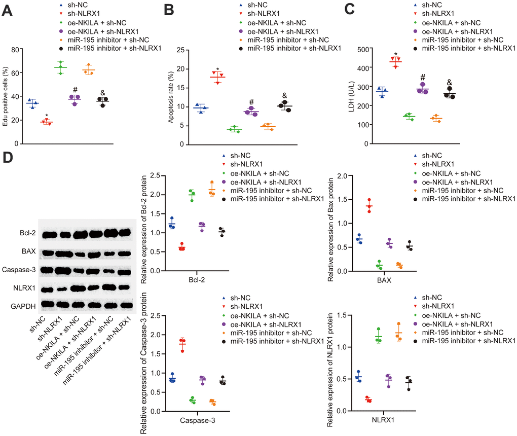 In order to further investigate the mechanism of NLRX1 in injured neurons, injured neurons were treated with sh-NLRX1 alone or in the presence of oe-NKILA or miR-195 inhibitor. The results displayed that NLRX1 expression was markedly decreased after the treatment of sh-NLRX1 (Figure 5D). Then, EdU assay and flow cytometry were conducted to measure the neuronal proliferation and apoptosis in injured neurons. As shown in Figure 5A, 5B, the injured neurons showed decreased cell proliferation and increased cell apoptosis following the treatment of sh-NLRX1. The results in Figure 5C demonstrated that silencing NLRX1 led to increased LDH content. Western blot analysis revealed that the expression of Bcl-2 was decreased, while the expression of Bax and Caspase-3 was increased in injured neurons after silencing NLRX1 (Figure 5D). Nonetheless, the treatment of sh-NLRX1 decreased the expression of NLRX1 and Bcl-2, as well as in cell proliferation, but increased Bax and Caspase-3 expression, LDH content and cell apoptosis in the presence of oe-NKILA and miR-195 inhibitor (Figure 5A–5D). Taken together, the upregulation of NKILA promotes functional recovery of injured neurons via the upregulation of miR-195-dependent NLRX1.