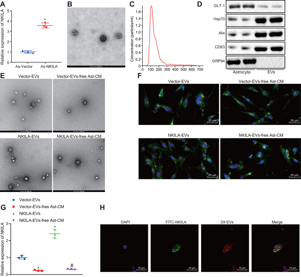 To validate whether NKILA was delivered from astrocytes to neurons by EVs, NKILA in astrocytes were overexpressed. As depicted in Figure 6A, NKILA expression was significantly increased in astrocytes after NKILA overexpression, validating the successful infection efficiency. The characterization of EVs using TEM and nanoparticle tracking analysis demonstrated that EVs ranged from 50 to 500 nm in diameter in cup-shaped morphology (Figure 6B, 6C). As shown in Figure 6D, Western blot analysis showed positive expression for Hsp70, CD63 and Alix, but negative expression for GRP94, while GLT-1 was highly expressed in astrocytes. It was observed that the uptake of EVs by neurons was notably elevated after overexpression of NKILA (Figure 6E, 6F). We next examined the expression of NKILA in EVs isolated from astrocytes. The results showed that the expression of NKILA was mainly distributed in EVs, and the expression of NKILA in the derived EVs was increased significantly in EVs extracted from astrocytes overexpressing NKILA (Figure 6G). Afterwards, astrocytes were infected with FITC-labeled NKILA-containing EVs. EVs were then extracted and incubated with Dil-labelled-neurons (red) for 48 h. The co-localization of FITC and Dil were observed in the neurons under the confocal laser microscopy (Figure 6H). It was found that FITC-NKILA-containing EVs were internalized in the neurons. Coherently, NKILA was transferred from astrocytes into neurons via EVs.