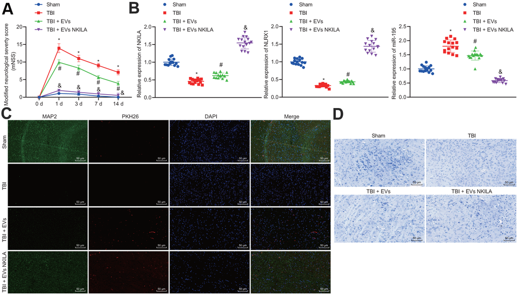 To validate the efficacy of astrocyte-derived EVs, NKILA-containing EVs were injected into a mouse model of TBI. Results demonstrated that TBI mice exhibited higher modified nervous system severity score (mNSS) on day 3 and continued on day 14, while marked reduction was observed upon EV treatment on TBI mice, and mice treated with NKILA-enriched EVs exhibited the most markedly lower mNSS (Figure 8A). Thereafter, we isolated mouse left cerebral cortex tissue and RT-qPCR found that compared with the sham-operated mice, the levels of NKILA and NLRX1 in the TBI mice were significantly reduced, while the level of miR-195 increased, while an opposite trend was observed upon EV treatment and mice treated with NKILA-enriched EVs exhibited a more significantly opposite trend compared with TBI mice (Figure 8B). Immunofluorescence was performed to assess the expression of neuron marker MAP2 in PKH26-labeled EVs, revealing that the expression of MAP2 was reduced in TBI mice compared with the sham group, while its expression was increased in response to EV treatment in TBI mice, and significantly higher in TBI mice treated with NKILA-enriched EVs. Meanwhile, the presence of red fluorescence in TBI mice treated with EVs or NKILA-enriched EVs indicated that the EVs successfully transferred the brain tissue (Figure 8C). As expected, the results of Nissl staining supported the results of immunofluorescence (Figure 8D). Therefore, astrocyte-derived EVs loaded with NKILA could promote brain recovery in TBI mice.
