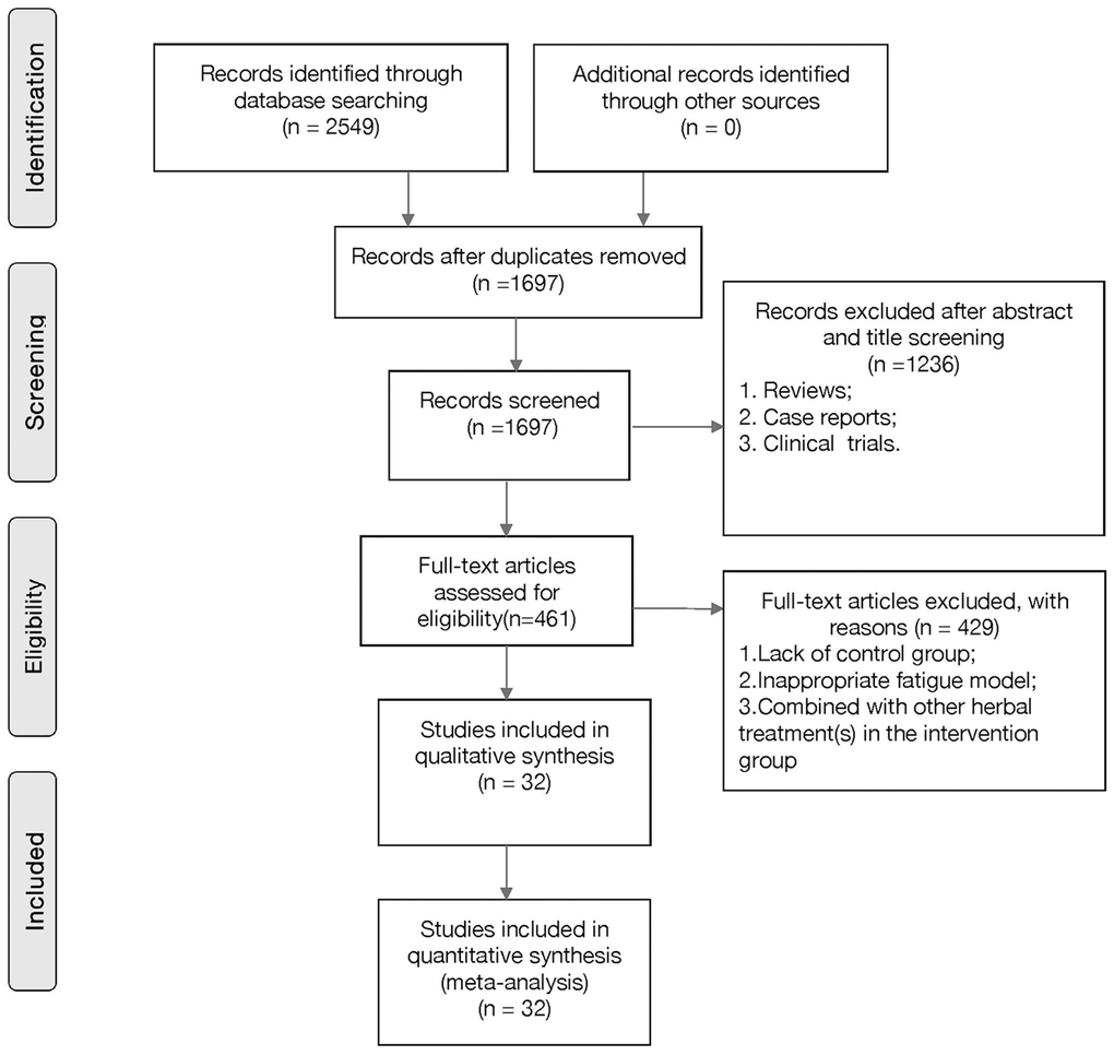 A total of 2,549 hits were found in an electronic database search, of which 852 duplicates were removed. We then screened titles and abstracts, and 1,236 further studies were excluded because they were clinical trials, case reports, or review articles. Through full-text evaluation of the remaining 461 studies, 429 were excluded for at least one of the following reasons: (1) unavailability of data; (2) not predetermined outcome index; (3) no in vivo model; (4) no control group; or (5) the intervention group did not receive G-Rg1 as a monotherapy. Eventually, 32 studies were selected (Figure 2).