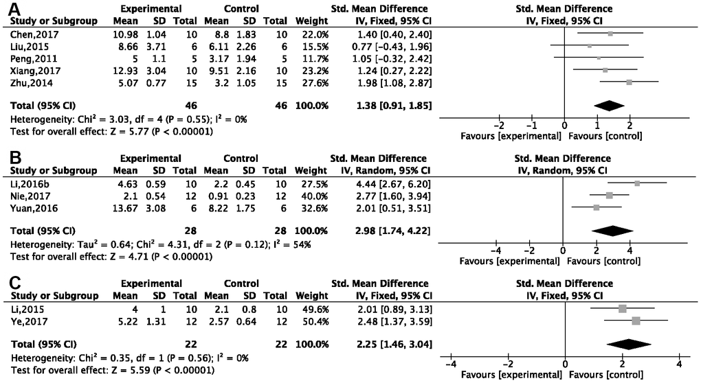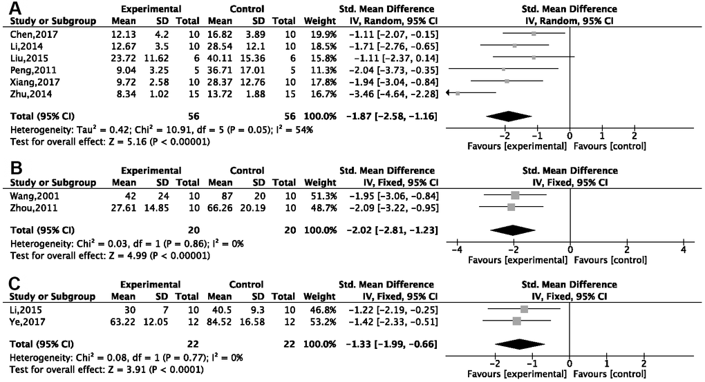 Third, animal studies with a less rigorous design may exaggerate the real effects. The quality of the included studies was moderate. Study quality is a multidimensional concept that is related to several different factors, including a trial’s design, conduction, analyses, clinical applicability, and reporting [59]. The assessment of the risk of bias could help to avoid over- or underestimating the parameters of interest, and this is vital when interpreting study results [60]. However, using different scales for quality appraisal can lead to inconsistent results if the scales are notably different in their complexity and dimensions [61]. Furthermore, the extent to which the quality of reports reflects the quality of randomized controlled trials (RCTs) is still a matter of debate [62].