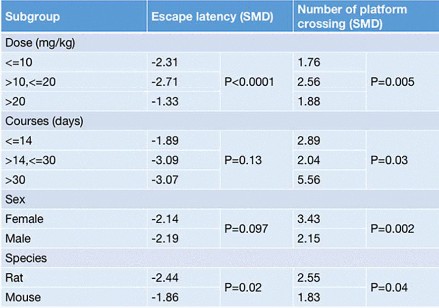 Stratified analyses of the EL and the NOPC were conducted based on the variables involved in the dosage and treatment course of G-Rg1, the animal species, and the animal sex, aiming to explore potential methodological differences that may have affected the treatment outcomes. For both the EL and the NOPC, a dosage greater than 10 mg/kg and less than 20 mg/kg was associated with more positive outcomes compared with a dosage less than 10 mg/kg or more than 20 mg/kg (EL: SMD≤10 mg/kg = −2.31, SMD>10,≤20 mg/kg = −2.71, SMD>20 mg/kg = −1.33, P < 0.0001; NOPC: SMD≤10 mg/kg = 1.76, SMD>10,≤20 mg/kg = 2.56, SMD>20 mg/kg = 1.88, P = 0.05. Figure 5). There was a significant difference in the effect of G-Rg1 on decreasing the NOPC for different treatment courses, but no significant difference on improving the EL (EL: SMD≤14 days = −1.89, SMD>14,≤30 days = −3.09, SMD>30 days = −3.07, P =0.13; NOPC: SMD≤14 days = 2.89, SMD>14,≤30 days = 2.04, SMD>30 days = 5.56, P = 0.03. Figure 5). The effect of G-Rg1 was greater in rat species than mice species for both the EL and the NOPC (EL: SMDrat = −2.44, SMDmice = −1.86, P = 0.02; NOPC: SMDrat = 2.55, SMDmice = 1.83, P = 0.04, Figure 5). In the subgroup analysis of animal sex, the effect of G-Rg1 on the NOPC was significantly larger in female mice (SMDfemale = 3.43, SMDmale = 2.15, P = 0.002, Figure 5), whereas there was no significant difference in the EL (SMDfemale = −2.14, SMDmale = −2.19, P = 0.097, Figure 5).