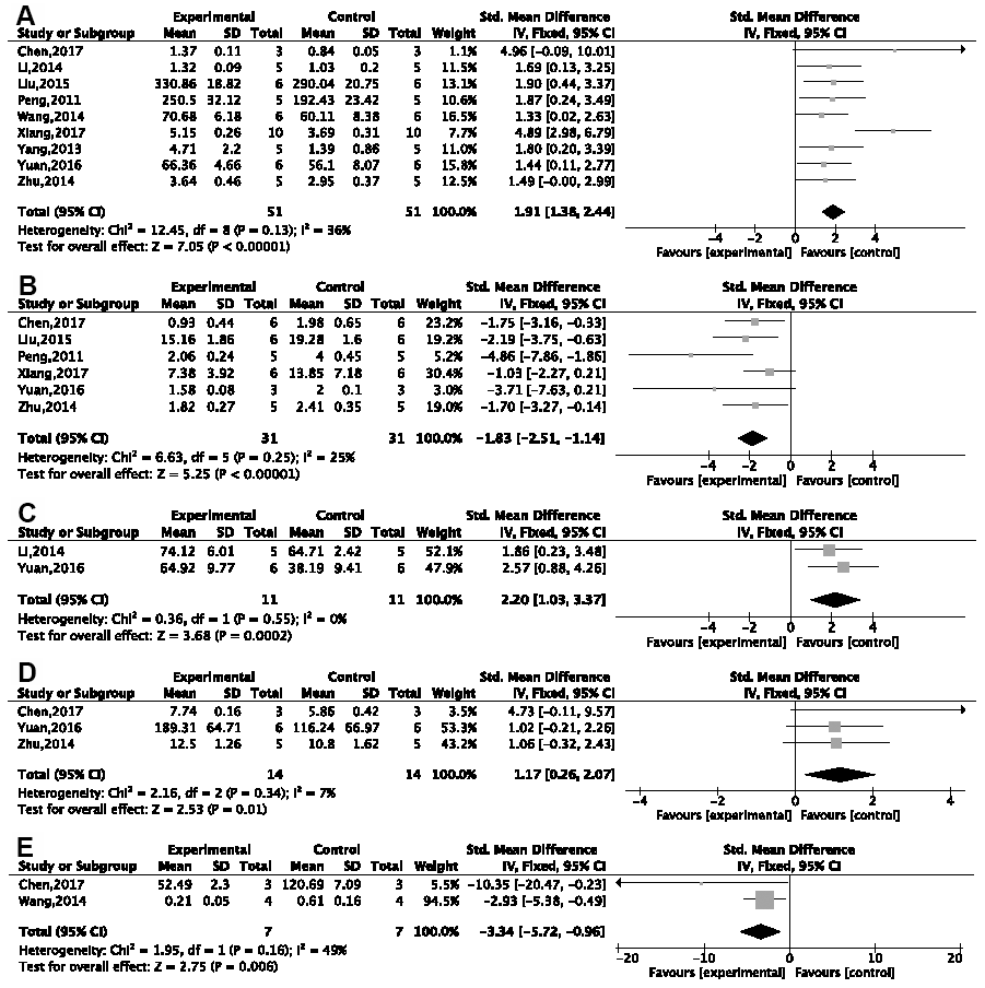 A remarkable effect of G-Rg1 in increasing the activity of superoxide dismutase (SOD) was seen in a meta-analysis of nine studies [26–31, 39, 41, 45] {P < 0.00001; SMD = 1.91, 95%CI [1.38, 2.44]; heterogeneity: χ2 = 12.45, df = 8 (P = 0.13); I2 = 36%, Figure 6A}; six studies [26, 27, 29–31, 41] in decreasing malondialdehyde (MDA) {P < 0.00001; SMD = −1.83, 95%CI [−2.51, −1.14]; heterogeneity: χ2 = 6.63, df = 5 (P = 0.25); I2 = 25%, Figure 6B}; and three studies [26, 28, 41] in increasing glutathione (GSH) {P < 0.0001; SMD = 2.51, 95%CI [1.36, 3.65]; heterogeneity: χ2 = 7.19, df = 2 (P = 0.03); I2 = 72%}; and a sensitivity analysis of two studies [28, 41] showed good heterogeneity {P = 0.0002; SMD = 2.20, 95%CI [1.03, 3.37]; heterogeneity: χ2 = 0.36, df = 1 (P = 0.55); I2 = 0%, Figure 6C}. By comparison with the control group, meta-analysis of three studies [26, 31, 41] showed that G-Rg1 increases the level of glutathione peroxidase {P = 0.01; SMD = 1.17, 95%CI [0.26, 2.07]; heterogeneity: χ2 = 2.16, df = 2 (P = 0.34); I2 = 7%, Figure 6D} and two studies [31, 39] showed a decrease in reactive oxygen species (ROS) {P = 0.006; SMD = −3.34, 95%CI [−5.72, −0.96]; heterogeneity: χ2 = 1.95, df = 1 (P = 0.16); I2 = 49%, Figure 6E}.