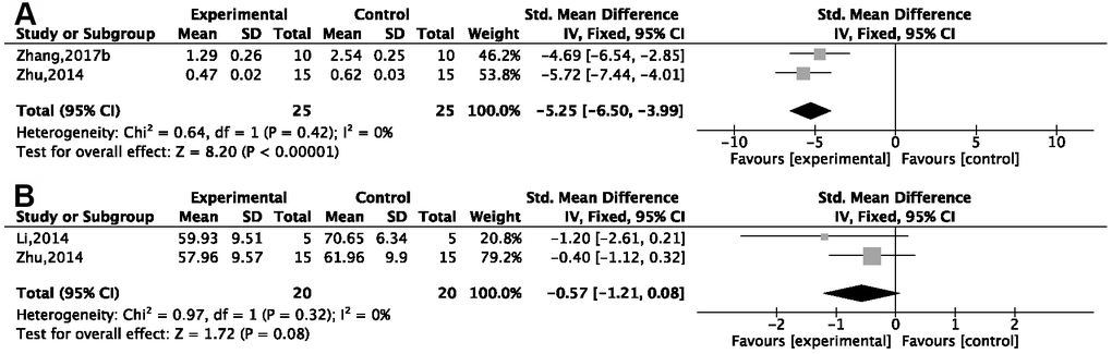 Two studies [26, 30] showed a remarkable effect of G-Rg1 in decreasing tumor necrosis factor α (TNF-α; P < 0.05). Compared with the control group, one study [28] showed a decrease in interleukin (IL)-1 in the G-Rg1 group (P < 0.05); three studies [26, 30, 51] showed a decrease in IL-1β {P < 0.00001; SMD = −3.37, 95%CI [−4.19, −2.54]; heterogeneity: χ2 = 15.19, df = 2 (P = 0.0005); I2 = 87%}; and sensitivity analysis of two studies [26, 51] showed good homogeneity {P < 0.00001; SMD = −5.25, 95%CI [−6.50, −3.99]; heterogeneity: χ2 = 0.64, df = 1 (P = 0.42); I2 = 0%, Figure 7A}. In three studies, IL-6 was seen to decrease [26, 28, 30] {P < 0.00001; SMD = −0.94, 95%CI [−1.56, −0.31]; heterogeneity: χ2 = 23.99, df = 2 (P < 0.00001); I2 = 92%}. Due to notable heterogeneity, sensitivity analyses were performed, and the results showed more homogeneity [26, 28] {P < 0.0001; SMD = −0.57, 95%CI [−1.21, −0.88]; heterogeneity: χ2 = 0.97, df = 1 (P = 0.55); I2 = 0%, Figure 7B}. IL-18 was seen to decrease in the G-Rg1 group in one study [51] when compared with a control group.