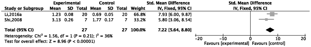 Meta-analysis of two studies [40, 50] showed a remarkable effect of G-Rg1 on increasing brain-derived neurotrophic factor (BDNF) {P < 0.00001; SMD = 7.05, 95%CI [5.64, 8.80]; heterogeneity: χ2 = 1.56, df = 1 (P = 0.21); I2 = 36%, Figure 8}. One study [42] reported that G-Rg1 treatment could increase the expression of multiple synaptic proteins such as synaptosomal-associated protein 25 (SNP25), synapsin 2 (SYN2), and complexin 2. The results indicated that G-Rg1 may ameliorate synaptic plasticity.