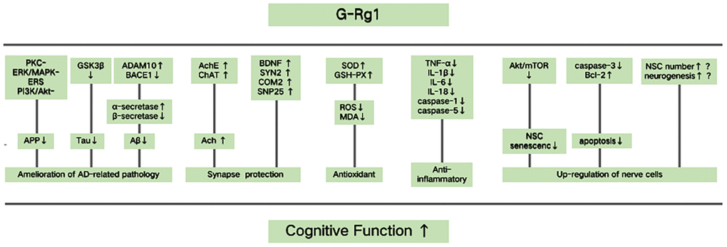 The present study showed that G-Rg1 could improve learning and memory function in most animal models of AD. The potential mechanisms involved included antioxidant and anti-inflammatory effects, amelioration of AD-related pathology, synapse protection, and up-regulation of nerve cells via multiple signaling pathways.