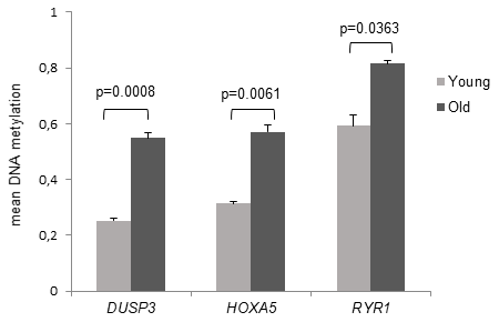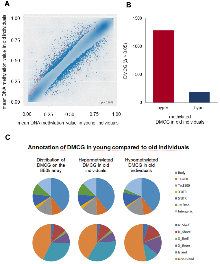 In the course of aging epigenetic mechanisms play an important role and in particular, changes in DNA methylation are associated with aging [44]. Here, we were interested to identify specific genomic loci differentially methylated in the aging process which may basically be assessed by genome-wide analysis and single gene analysis. Hence, it was the aim of this study to identify specific genes or regulatory regions with significant age-related MDs and to study whether altered DNAm may be accompanied by altered mRNA or protein expression.