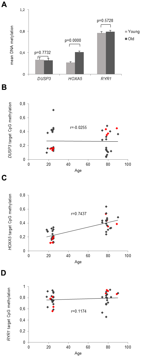 Based on our filter criteria used for the Bead array analysis, target CpGs of HOXA5, DUSP3 and RYR1 were selected for bisulfite profiling (Bi-PROF) [42] in a cohort of young (average age: 23.4 yrs, range: 18-25 yrs) and old (average age: 79.6 yrs, range: 75-90 yrs) adults, n = 20, respectively. Deep sequencing revealed no significant age-associated MD for DUSP3 and RYR1 neither for the target CpG site (Figure 3A) nor for the mean amplicon methylation.