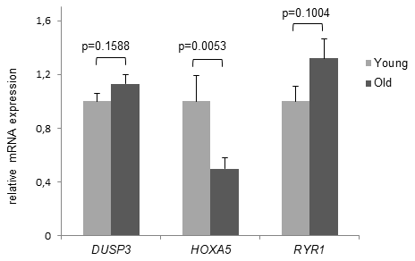 Although deep sequencing revealed no significant age-associated MD for DUSP3 and RYR1, in the next set of experiments we compared HOXA5, DUSP3 and RYR1 DNAm results to the gene expression level. mRNA expression was studied in the same cohorts of young and old volunteers that were included in Bi-PROF as well as in 10 additional volunteers, respectively (average age: 23.0 yrs, range: 18-25 yrs, n = 30 and average age: 81.1 yrs, range: 75-90 yrs, n = 30). As presented in Figure 4, HOXA5 mRNA expression is significantly downregulated in monocytes from old subjects compared to the young cohort (p = 0.0053) while DUSP3 and RYR1 mRNA expression shows no significant difference as was expected from the deep sequencing results. Since DNAm of HOXA5 in the promoter region is significantly increased in old subjects, significant down-regulation of HOXA5 mRNA expression corresponds well with these results. Therefore, only HOXA5 was chosen for further investigation of gene expression on the protein level.