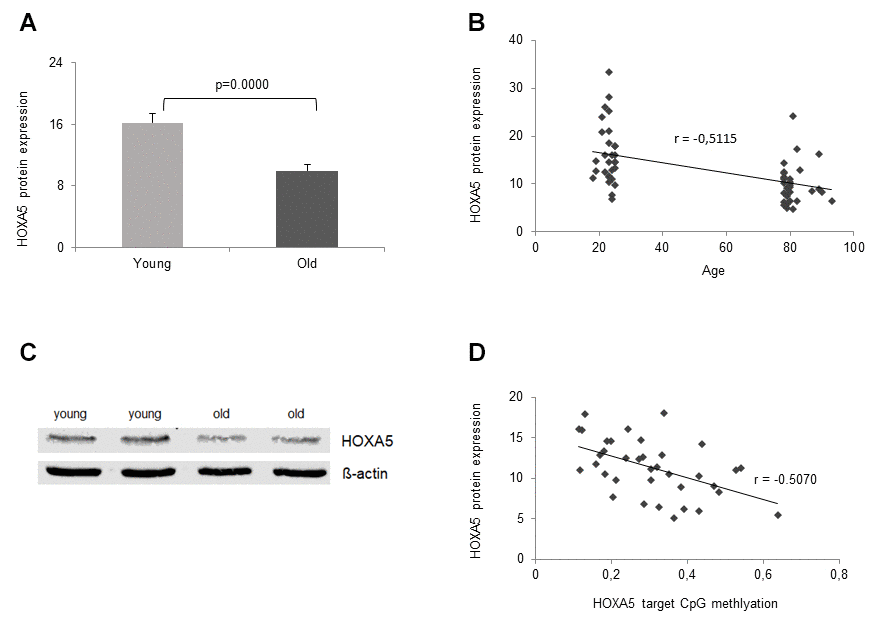 Next, we were intrigued to find out, if ageing-related significant down-regulation of HOXA5 mRNA expression is translated into protein expression. Therefore, HOXA5 protein expression was studied in the same cohorts of young and old volunteers that were included in the mRNA expression analysis, n = 30, respectively. In accordance with significant down-regulation of HOXA5 mRNA expression in the old cohort, HOXA5 protein levels in the elderly were also significantly reduced (p = 3x10-5, Figure 5A). Further, a linear correlation between HOXA5 protein expression and the participants age was observed as depicted in Figure 5B. Decreasing protein levels were shown to correlate with increasing age as reflected in the respective correlation coefficient (r = -0.5357). As assessed by western blot analysis, HOXA5 protein levels also correlate negatively with increasing age (Figure 5C). As summarized in Figure 5D HOXA5 protein expression is also negatively correlated with promoter methylation which is reflected in the respective correlation coefficient (r = -0.5070). Altogether, our findings suggest that age-related up-regulation of HOXA5 methylation may lead to the down-regulation of HOXA5 mRNA and protein expression in old age.