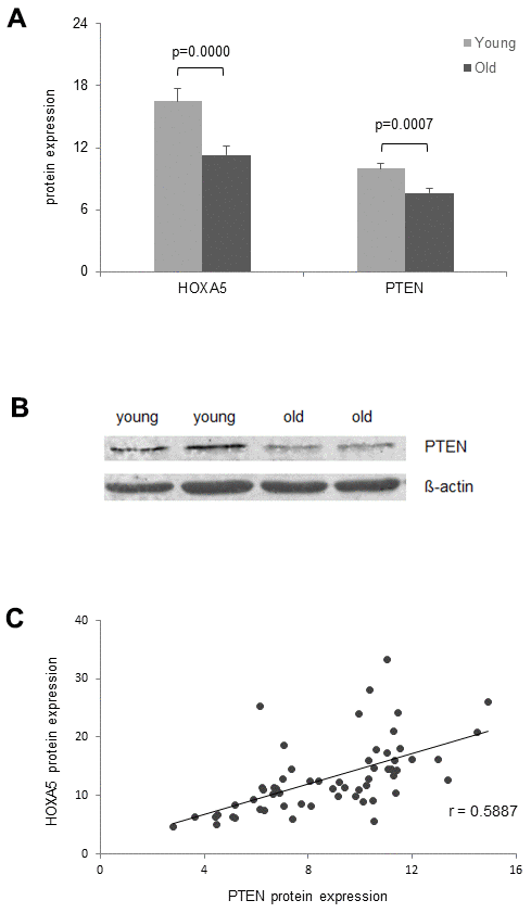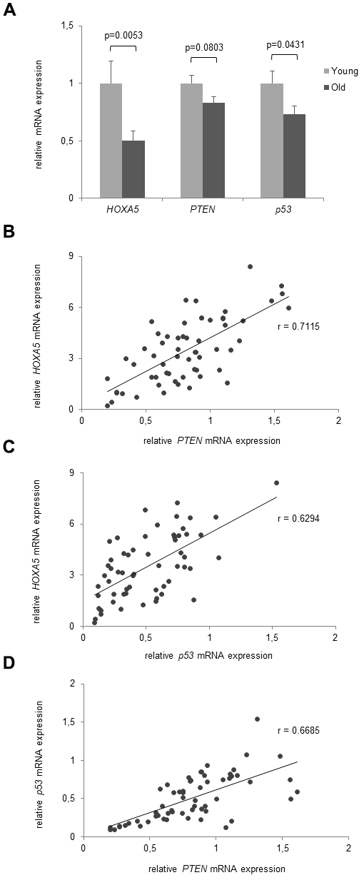 Significant aging-associated correlation of HOXA5 expression with p53 and PTEN