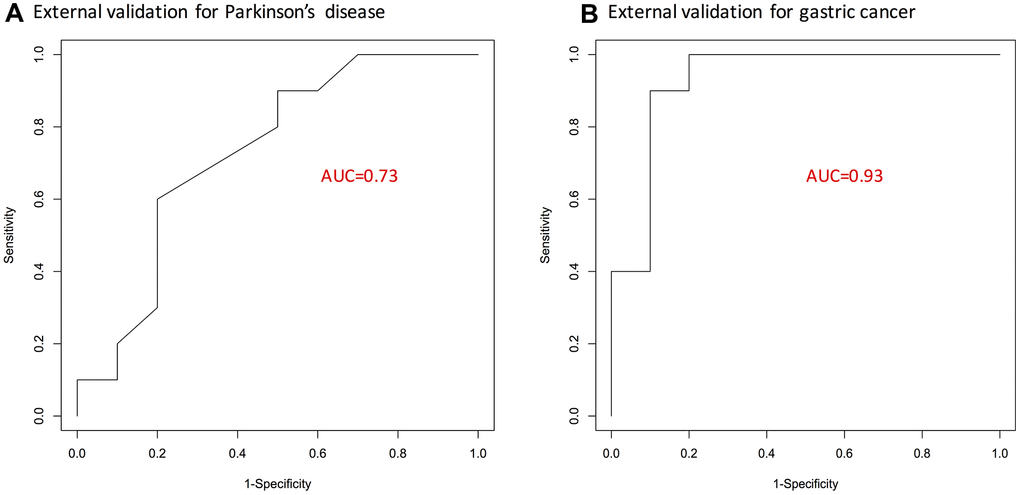 Lastly, a respective logistic regression model with 15 overlapped genes as predictors was fit for either gastric cancer or Parkinson’s disease microarray dataset. The predictive capacity of resulting 15-gene signatures for gastric cancer and Parkinson’s disease was validated on external datasets. As shown by the ROC curves in Figure 2, the list of 15-genes was validated to perform fairly well; especially for gastric cancer, it achieved an AUC statistic of 0.93.