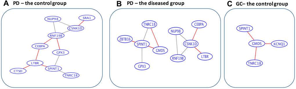Using the String software, only four connections (CSNK1D to ZBTB16, ZBTB16 to RNF19B, RNF19B to CSNK1D, and ZBTB16 to CEBPA) were revealed for the 15 overlapped genes. As a result, a data-driven strategy was used to obtain the information on gene-to-gene interactions (as stated in the Methods section). The corresponding networks for the information on co-expression of the 15 overlapped genes between Parkinson’s disease and gastric cancer (through the calculation of Spearman’s correlation coefficients), are presented in Figure 3. Among the gastric cancer patients, all the 15 overlapping genes appear to be isolated from each other, whereas among the controls, three gene pairs (SPINT1 and GMDS, GMDS and TNRC18, and CSNK1D and RNF19B) are connected. This may correspond to a loss of connectivity in the gastric cancer patients, which is consistent with the findings by Anglani et al. [38]. In contrast, for Parkinson’s disease patients, five pairs of connections were gained, six pairs were lost, while five pairs remained connected. Interestingly, two loss-of-connectivity pairs for gastric cancer (SPINT1 and GMDS, and GMDS and TNRC18) were observed among the five gain-of-connectivity pairs for Parkinson’s disease, implying a possible opposite direction of change at the gene-to-gene interaction level for Parkinson’s disease and gastric cancer.