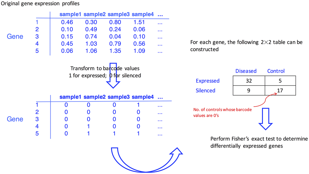 To determine if the expressed ratios differed in the diseased group versus the control group, Fisher’s exact test for individual genes was carried out upon the barcode values. Genes with a false discovery rate (FDR) of < 0.05, which was calculated through the Benjamini-Hochberg (BH) procedure [51] to adjust for multiple testing issue, were considered as differentially expressed genes in the respective gastric cancer and Parkinson’s disease cohorts. The flowchart of the proposed procedure is given in Figure 4.