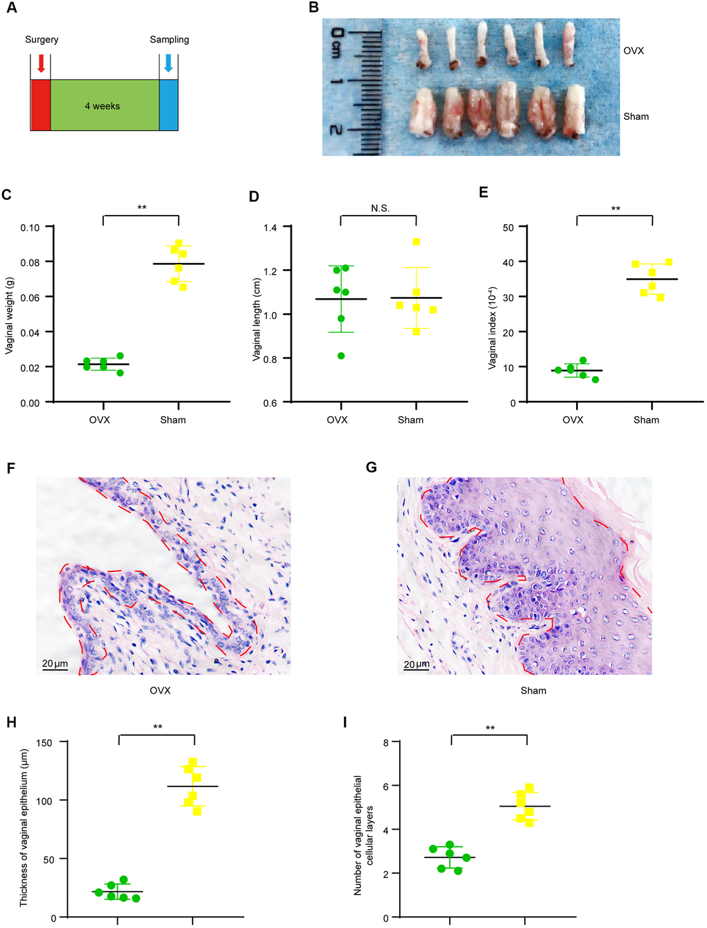 It has been well accepted that the ovary is the domain source of estrogen hormone in females and the estrogen hormone has various biological effects on both systemic and organ health, including the reproductive system. Therefore, ovariectomy could theoretically cause functional and morphological change in the reproductive tract. We observed that vulvas of OVX mice were atrophic and the vaginal orifices got closed naturally soon after surgery. We first evaluated if 4-weeks’ period after ovariectomy surgery is enough to induce a significant vaginal atrophy as presented in the timeline (Figure 1A). As shown by the representative image of isolated vaginas, vaginas of ovariectomy group (OVX group) were small than those of sham operated group (Sham group) 4 weeks after modeling surgery (Figure 1B). Furthermore, vaginal weights of the OVX group (0.021 ± 0.001 g) were significant lighter than those of the Sham group (0.079 ± 0.004 g) (Figure 1C) though no significant difference was observed in vaginal length between the OVX group (1.06 ± 0.06 cm) and the Sham group (1.07 ± 0.06 cm) (Figure 1D), and vagina index (vaginal weight/body weight *10-4) of the OVX group (8.90 ± 0.77) were significant lighter than those of the Sham group (34.94 ± 1.76) (Figure 1E). We also observed prominent morphological changes in the vaginal epithelium of OVX group when compared to that of the Sham group. The OVX group had thinner vaginal epithelium (21.70 ± 2.64μm) when compared to that of the Sham group (111.69 ± 6.86 μm) (Figure 1B–1D). The average number of vaginal epithelial cellular layer in the OVX group (2.7 ± 0.2) was smaller than that in the Sham group (5.1 ± 0.3) (Figure 1E). All these results indicated that 4 weeks after ovariectomy, the vaginal health status was dramatically altered and that the vagina was atrophic in ovariectomized mice.