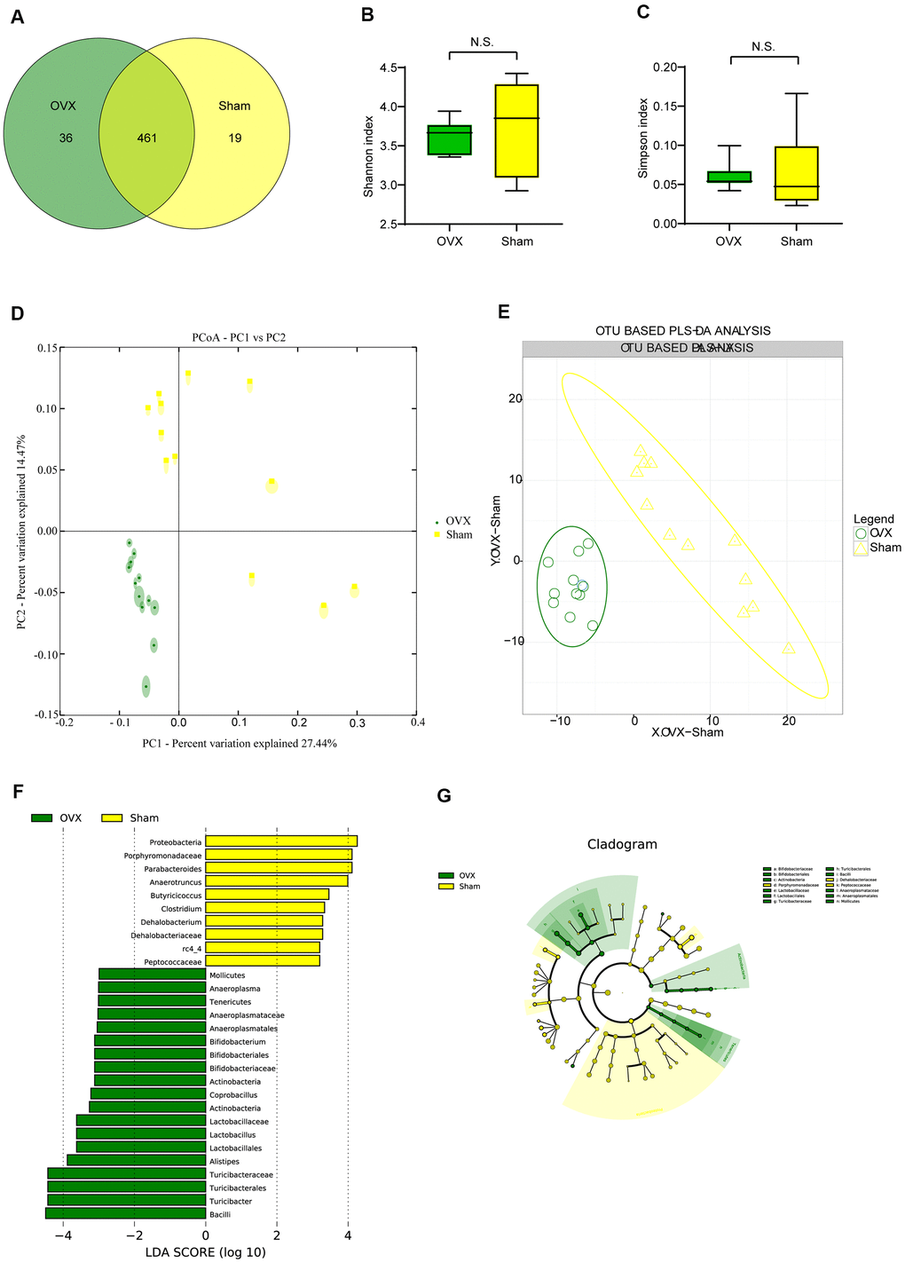We performed 16S rRNA analysis on OVX and Sham mice feces aiming at exploring whether the gut flora would change in ovariectomized female mice. Wayne diagram analysis revealed that while there were 461 Operational Taxonomic Units (OTUs) shared by the two groups, there were 36 specific OTUs in the OVX group and 19 specific OTUs in the Sham group (Figure 2A). α-diversity analysis showed that there were no significant difference of Shannon diversity index (Figure 2B) and Simpson diversity index (Figure 2C) between OVX group and Sham group while observed species (sobs) index (Supplementary Figure 1A) and Chao1 index (Supplementary Figure 1B) in OVX group were significant higher than those of the Sham group. All of these differences supported higher species diversity within the feces of OVX group and showed a tendency that ovariectomy could have an influence on the gut microbiota. OUT-based β-diversity analysis including principal component analysis (PCA) and partial least squares discrimination analysis (PLS-DA) were employed to investigate the difference of gut microbiota composition between the OVX group and the Sham group. The results of PCA (Figure 2D) and (PLS-DA (Figure 2E) illustrated a different gut microbiota between the OVX group and the Sham group.