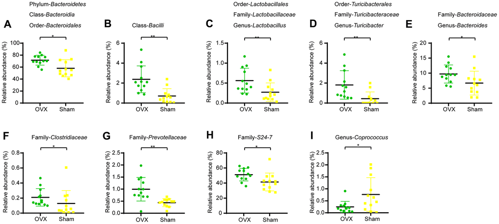 We profiled the composition of gut microbiota at the genus level for the OVX group and the Sham group (Supplementary Figure 1C) and performed clustering heat map analysis at genus level based on the Log10 value of relative abundance of each microbial categories at genus level (Supplementary Figure 1D). As shown by the bar plots of microbes at genus level (Supplementary Figure 1C), Akkermansia, Bacteroides, Prevotella, Parabacteroides, Sutterella, Oscillospira, Turicibacter and Ruminococus were the main categories in both OVX group and Sham group. And clustering heat map analysis showed separation trends between the microbial composition of OVX group and that of the Sham group. We further employed linear discriminant analysis Effect Size (LEfSe) analysis to determine the microbial categories most likely to explain differences between the OVX group and the Sham group by coupling standard tests for statistical significance with additional tests encompassing biological consistency and effect relevance (Figure 2F, 2G) and we further showed these differentially distributed microbial categories whose relative abundance were more than 0.1% (Figure 3A–3P). Briefly, there were 15 categories were more abundant in OVX group and 1 category was more abundant in Sham group (Figure 3A–3P).