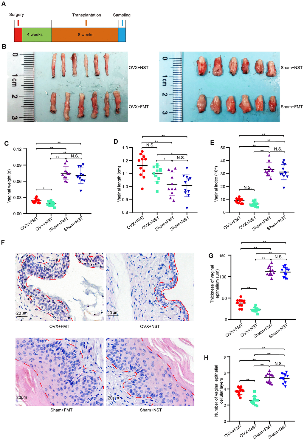 To further explore whether and how the ovary status can influence the gut flora and potential effects of the gut flora on the vaginal health, we performed transplantation experiments on ovariected and sham operated mice. Briefly, another cohort of young mice whose ovaries were not meddled with (n=15) were recruited as fresh feces’ donors. The fresh feces were collected and suspended with normal sterile saline with fixed concentration at 1-gram feces per milliliter to make a suspension, then the suspension was filtered by a fertile 30 mesh sieve before lavage. OVX group mice (hereinafter named OVX+FT group, n=12) and Sham group mice (hereinafter named Sham+FT group, n=10) were randomly selected to receive lavage with 200ul fecal suspension, and another OVX group mice (hereinafter named OVX+NST group, n=12) and Sham group mice (hereinafter named Sham+NST group, n=10) were treated with 200ul normal sterile saline lavage as control. The transplantation experiments were performed every 3 days and stopped after 8 weeks since we noticed that the closed vaginal orifices after ovariectomy were open again in about half of OVX+FMT group mice. 3 days after the last lavage cycle, mice were starved for 12 hours before fecal, plasmatic and vaginal tissue samples were collected for all those mice. Body weights, vaginal weights and lengths are measured as described, and upper 1/3 of the vagina was fixed, dehydrated and paraffin-embedded for subsequent histological analysis. Feces, plasma were frozen in -80° C refrigerator immediately for further test.