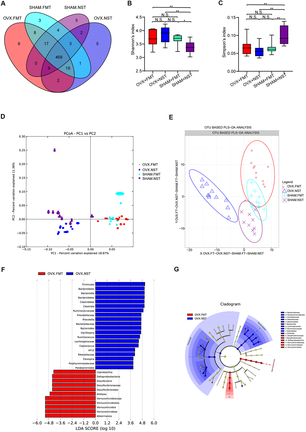 16 rDNA sequencing and analysis for fecal microbiota from OVX+FMT, OVX+NST, Sham+FMT and Sham+NST groups showed that there were 533 OTUs in OVX+FMT group, 510 OTUs in OVX+NST group, 524 OTUs in Sham+FMT group and 509 OTUs in Sham+NST group (Figure 5A). When pairwise compared to find out the shared OTUs numbers among these four groups, we found that the shared OTUs number between the OVX+FMT group and the Sham+ FMT was bigger than any others pairwise groups. When further conducted α-diversity analysis with one-way ANOVA followed by post hoc test, no significant difference was observed between OVX+FMT and OVX+NST groups for Shannon index (Figure 5B) Simpson index (Figure 5C), sobs index (Supplementary Figure 2A) and Chao1 index (Supplementary Figure 2B). However, β-diversity analysis including PCA (Figure 5D) and PLS-DA (Figure 5E) indicated that gut microbiota of the OVX+FMT group was similar to that of the Sham+FMT group but was different to that of the OVX+NST group. The PCA diagram also indicated that fecal microbiota transplantation could modulate the gut microbiota since the samples from the normal sterile saline gavage groups (including OVX+NST and Sham+NST groups) were relatively close while the samples from feces transplanted groups (including OVX+FMT and Sham+FMT groups) were close, and samples from the normal sterile saline gavage groups were relative far from samples from feces transplanted groups (Figure 5D). We further performed microbial taxonomy in OVX+FMT, OVX+NST, Sham+FMT and Sham+NST groups. The bar plots for fecal microbes at genus level for four groups showed that Akkermansia, Prevotella, Bacteroides, Helicobacter, Oscillospira, Sutterella, Desulfovibrio, Ruminococus, Coprococcus and Lactobacillus were the main categories at genus level (Supplementary Figure 2C). And samples from OVX+NST group were different from other samples as shown by the clustering heat map analysis (Supplementary Figure 2D). We further performed the LEfSe analysis to select the microbes that are distinguished to the OVX+FMT group and the OVX+NST group (Figure 5F, 5G) and displayed the differentially distributed categories whose relative abundance were above 0.1% (Figure 6A–6S). Briefly, there were 7 categories at different taxonomic rankings were more abundant in OVX+FMT group than in OVX+NST group and there were 11 categories at different taxonomic rankings were more abundant in OVX+NST group than in OVX+FMT group. Interestingly, all these differentially distributed 18 categories shared similar abundance among OVX+FMT group, Sham+FMT group and Sham+NST group. There was also only one category (Figure 6G, Order-Desulfovibrionales) more abundant in the OVX+FMT than the others 3 groups.