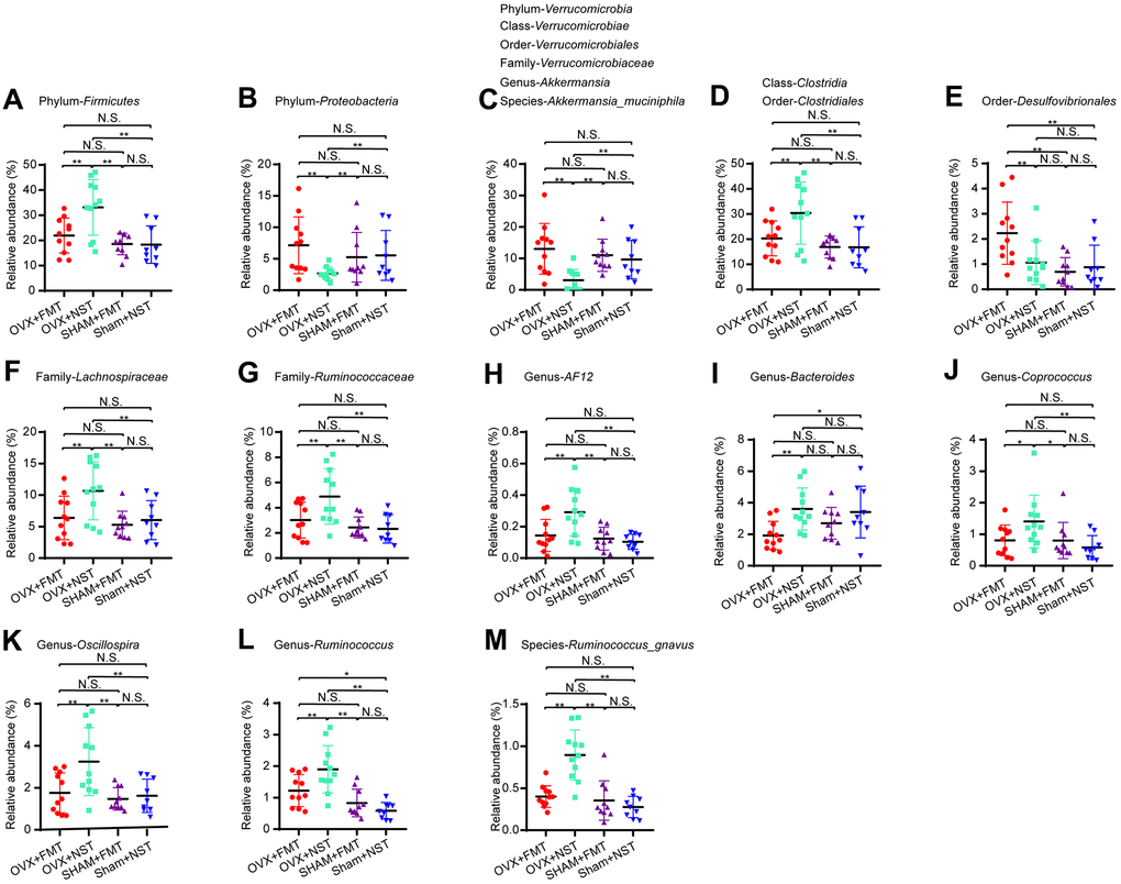 As we all know, fecal microbiota transplantation is an innovative investigational treatment for many diseases and conditions. In the current study, we performed fecal microbiota transplantation for OVX mice and alleviate the VVA signs of OVX mice at certain degree. Briefly, there are 18 microbial categories at different taxonomic rankings whose relative abundance were almost the same in OVX+FMT group, Sham+FMT and Sham+NST group. Of them, 7 microbial categories (Phylum-Proteobacteria, Phylum-Verrucomicrobia, Order-Verrucomicrobiales, Class-Verrucomicrobiae, Family-Verrucomicrobiaceae, Genus-Akkermansia, Species-Akkermansia_muciniphila) were more abundant in OVX+FMT group while 11 microbial categories (Phylum-Firmicutes, Class-Clostridia, Order-Clostridiales, Family-Lachnospiraceae, Family-Ruminococcaceae, Genus-AF12, Genus-Bacteroides, Genus-Coprococcus, Genus-Oscillospira, Genus-Ruminococcus, Species-Ruminococcus_gnavus) were less abundant in OVX+FMT group. It is likely that the 7 categories enriched in OVX+FMT group play positive role in vaginal regeneration while the 11 categories enriched in OVX+NST group play negative role in vaginal health, which need further study to confirm. Interestingly, of the 7 categories, Akkermansia_muciniphila as well as its 5 upper taxonomic rankings were all present and Akkermansia_muciniphila is regarded as an important probiotic [35]. Of the 11 categories enriched in OVX+NST group, some lower taxonomic rankings of Class-Clostridia are pathogenic to both humans and animals [29, 30]. However, exact roles of certain microbes should be carefully studied with some more complex experiments such as single gut microbiota transplantation to germ free animal to obtain convincing conclusions.