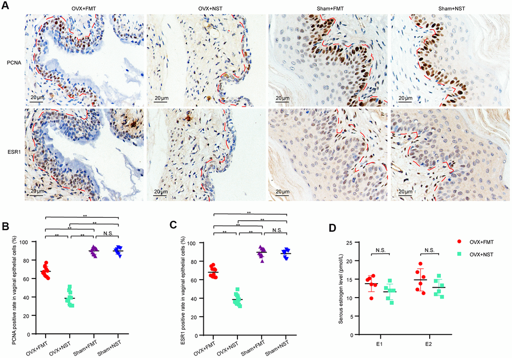 Since as shown in our study, vaginal epithelium is a good marker for vaginal atrophy and it is assumed that the epithelial thickness is secondary to epithelial cells proliferation, we were curious whether the vaginal epithelial proliferative capacity would be enhanced by fecal transplantation in the OVX+FMT group. We performed immunohistochemical analysis for PCNA and ESR1 (Figure 7A) on the mice vaginal sections and found that the percentage of PCNA(+) epithelial cells in the OVX+FMT group (67.8 ± 1.6) was visibly higher than that in the OVX+NST group (38.6 ± 2.0), and the percentage of PCNA(+) epithelial cells in both of these two groups were lower than those of Sham+FMT(89.9 ± 1.2) and Sham+NST group (89.8 ± 1.1)(Figure 7B), which indicated that fecal transplantation could somehow enhance epithelial proliferative capacity in ovariectomized mice. Similarly, the percentage of ESR1(+) epithelial cells in the OVX+FMT group (68.0 ± 1.5) were significant higher than that of the OVX+NST group (38.1 ± 1.7), and the percentage of ESR1(+) epithelial cells in Sham+FMT(89.6 ± 1.5) and Sham+NST group (88.2 ± 1.3) were near the same (Figure 7B). We further analyzed serum estrogen believing that estrogen can powerfully promote cellular proliferation in the reproductive tract. But the levels of serum estrogen including estrone (E1) and estradiol (E2) in the OVX+FMT group was not significantly different from those of the OVX+NST group (Figure 7D) (t-test, P>0.05).