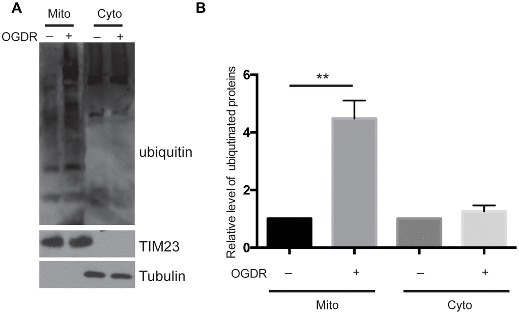 We used a ubiquitin antibody to explore the ubiquitination of mitochondrial and cytoplasmic proteins after OGDR insult (Figure 1). SK-N-BE(2) cells were cultured, and mitochondrial and cytoplasmic proteins were isolated after 45 min reperfusion following 4 h OGD. As demonstrated in Figure 1A, we found that the ubiquitination of mitochondrial proteins increased significantly after 45 min reperfusion following 4 h OGD(P=0.0052), while there was no significant change in the ubiquitination of cytoplasmic proteins (Figure 1A, 1B). These data suggest that mitochondrial proteins are rapidly ubiquitinated in the early stage of reperfusion after OGD.