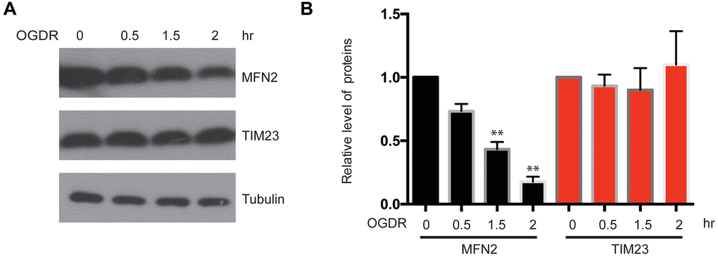 We have found that the ubiquitination of mitochondrial proteins and MFN2 was increased in the early stage of reperfusion after 4 h OGD, we further analyzed the expression of mitochondrial proteins after OGDR treatment. Reduced MFN2 protein expression was observed in SK-N-BE(2) cells subjected to 1.5 h (P=0.0085) and 2 h (P=0.0027) reperfusion following 4 h OGD. However, the expression of mitochondrial inner membrane protein TIM23 did not change significantly (Figure 3A, 3B). These data suggest that MFN2 is rapidly degraded in the early stage of reperfusion following OGD, which is an early event of mitochondrial damage induced by cerebral ischemia-reperfusion injury.