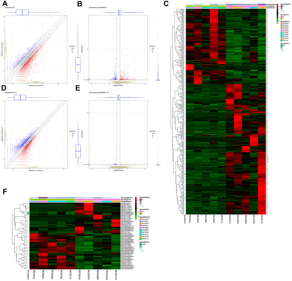 386 mRNAs (141 down-regulated and 245 up-regulated mRNAs) were differentially expressed in PET-high samples when compared to PET-low samples (Figure 1A, 1B). Hierarchical clustering of these differentially expressed mRNAs indicated that PET-high samples were indeed distinct from PET-low samples (Figure 1C). Moreover, 44 differentially expressed lncRNAs (24 down-regulated and 20 up-regulated lncRNAs) were identified between PET-high and PET-low samples (Figure 1D, 1E). Hierarchical clustering of differentially expressed lncRNAs again revealed that PET-high and PET-low samples were clustered in two distinct groups (Figure 1F).