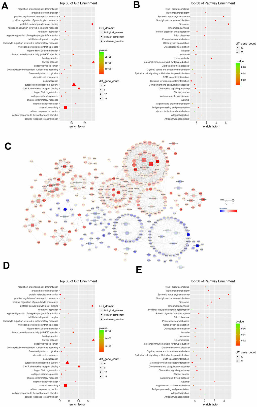 GO functional enrichment analysis indicated that differentially expressed mRNAs were significantly related to the fibrillar collagen (enrich factor = 23.22), platelet-derived growth factor binding (enrich factor = 22.87), and protein heterotrimerization (enrich factor = 20.13) (Figure 2A). Pathway enrichment analysis suggested these differentially expressed mRNAs were involved in the pathways of ribosome (enrich factor = 6.38), systemic lupus erythematosus (enrich factor = 5.87), and staphylococcus aureus infection (enrich factor = 4.99) (Figure 2B).