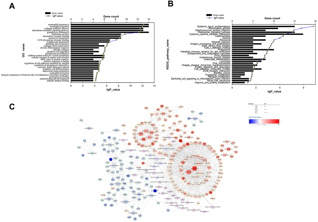 The differentially expressed mRNAs in lncRNA-mRNA co-expression network were enriched with the fibrillar collagen, platelet-derived growth factor binding, protein heterotrimerization, regulation of dendritic cell differentiation, and leukocyte migration involved in inflammatory response (Figure 2D). Pathway enrichment analysis for differentially expressed mRNAs in lncRNA-mRNA co-expression network indicated that the top ranked pathways were involved systemic lupus erythematosus, Staphylococcus aureus infection, phenylalanine metabolism, Leishmaniasis, and asthma (Figure 2E).