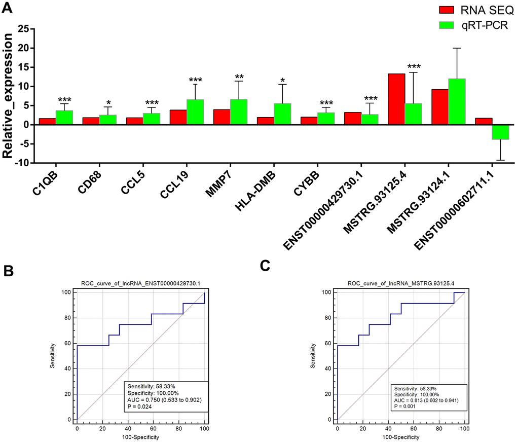 Expression levels of 7 mRNAs (C1QB, CD68, CCL5, CCL19, MMP7, HLA-DMB, and CYBB) and 4 lncRNAs (ENST00000429730.1, MSTRG.93125.4, MSTRG.93124.1, and ENST00000602711.1) that had relatively larger number of degree in lncRNA-target-pathway network were measured in the lung PET-high and PET-low tissue samples collected from 11 patients. The expression levels of C1QB, CD68, CCL5, CCL19, MMP7, HLA-DMB, and CYBB were validated to be significantly up-regulated in lung PET-high tissue samples (Figure 4A). Obviously higher expressions of two lncRNAs ENST00000429730.1 and MSTRG.93125.4 were found in lung PET-high tissue samples (Figure 4A). ROC curve analysis of ENST00000429730.1 showed that the AUC was 0.750 with a sensitivity of 58.33% and a specificity of 100.00% (p = 0.024) (Figure 4B), and the AUC of MSTRG.93125.4 was 0.813 with a sensitivity of 58.33% and a specificity of 100.00% (p = 0.001) (Figure 4C).
