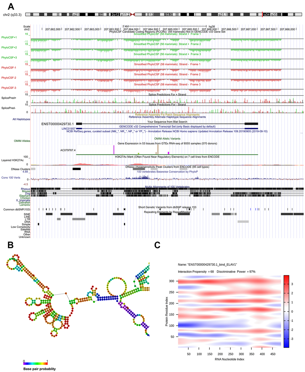 Genomic location of ENST00000429730.1 was predicted to be on chromosome 2q33.3 and assumed to be unable to encode genes (Figure 5A). The optimal secondary structure for ENST00000429730.1 had several hairpin loops with a minimum free energy (MFE) of -110.50 kcal/mol (Figure 5B). There were strong interactions of ENST00000429730.1 with proteins of ELAV1, TRA2B, PTBP1, SRSF9, and SRS10. The interaction between ENST00000429730.1 and ELAV1 has an interaction propensity of 68, and with the discriminative power of 97% (Figure 5C).