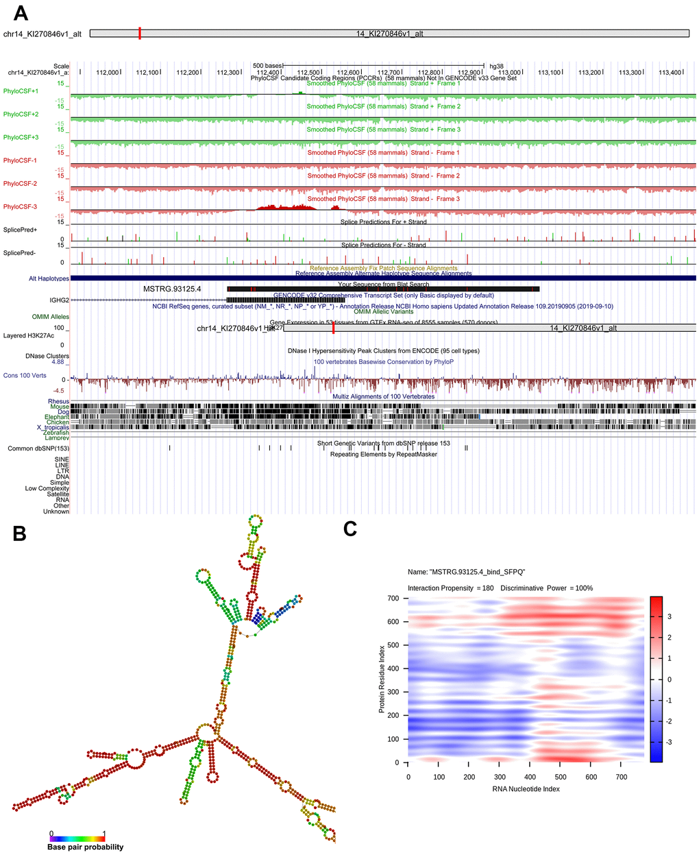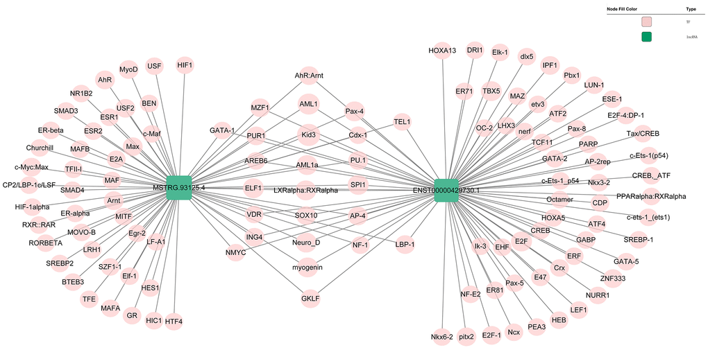 Genomic location of MSTRG.93125.4 was predicted to be on chromosome 14KI270846v1_alt and unable to encode genes (Figure 6A). The optimal secondary structure for MSTRG.93125.4 had the MFE of -359.20 kcal/mol (Figure 6B). For MSTRG.93125.4, strong interactions were found with proteins of SFPQ, PCBP1, LN28B, SRSF2, and PCBP2. The interaction between MSTRG.93125.4 and SFPQ has an interaction propensity of 180, with the discriminative power of 100% (Figure 6C). Prediction analysis of potential transcriptional factors showed that MSTRG.93125.4 can combine with 67 transcriptional factors (such as Kid3, AML1, myogenin, MyoD, and AP-4), and ENST00000429730.1 can combine with 82 transcriptional factors (such as AML1, TBX5, E2F, IPF1, and E2F-1) (Figure 7).