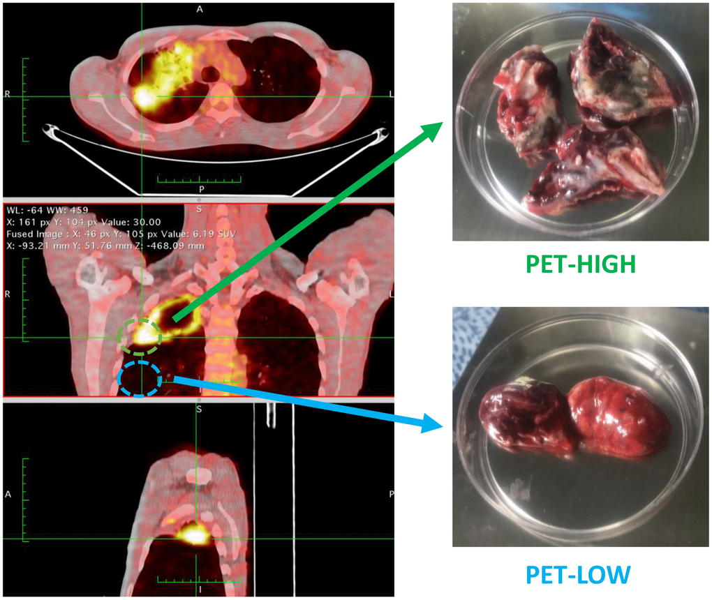 Five patients who diagnosed as sputum-negative pulmonary tuberculosis in our hospital from June 06 to December 2018 were enrolled for RNA-sequencing analysis. There were one male and four females, aged 20-38 years, with an average age of 31.2 ± 7.4 years (Supplementary Table 1). Lung tissue samples with high metabolic activity (PET-high) and low metabolic activity (PET-low) demonstrated by (FDG-PET/CT) were collected from these five participants for the subsequent sequencing (Figure 8). Moreover, lung PET-high and PET-low tissue samples collected from 11 enrolled subjects were used for experimental validation of expression changes by quantitative real-time PCR (qRT-PCR). There were 7 male and 4 females, aged 20-57 years, with an average age of 38.3 ± 11.3 years (Supplementary Table 2).