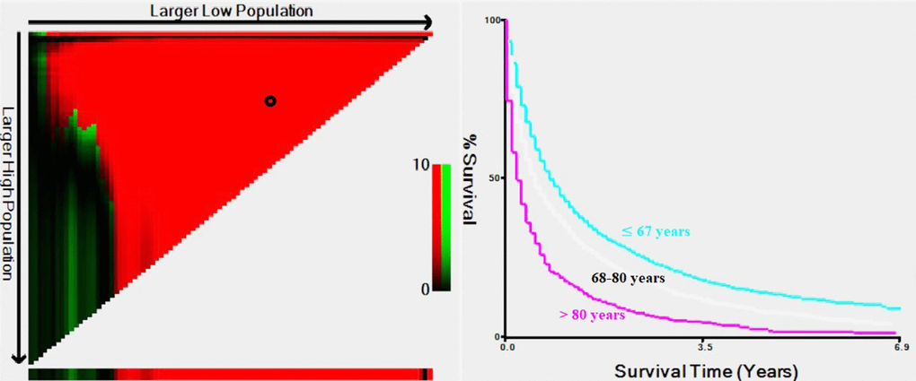 In total, 10,853 (13.7%) mRCC patients were selected among 79,063 patients with RCC. To better understand the metastasis patterns of RCC, we first compared the differences between patients with metastatic and nonmetastatic RCC (Supplementary Table 1). The results indicated that mRCC patients tended to be older, unmarried, white, and male and had a larger tumor size, higher grade, higher T stage and N stage, lower chance of undergoing radical nephrectomy or other operations and greater chance of receiving treatment, such as radiation and chemotherapy (P<0.001, Supplementary Table 1). Therefore, there were significant differences between the elderly patients and younger patients. We then used X-tile software to divide the patients by age into three groups (Figure 1). There were 49,801 diagnosed RCC patients ≤67 years old, and they were classified as the younger group; 29,262 (68-80 years old) patients were classified as the middle-aged group, and 6,492 patients were included in the older group (>80 years old). Moreover, among the total population of 10,853 mRCC patients, 6,131 (56.4%) were in the younger group, 3,255 (30.0%) were in the middle-aged group, and 1,467 (13.5%) were in the older group (>80 years old). The younger group had the lowest metastasis rate of 12.3% (6,131/49,801), the middle-aged group had a rate of 11.1% (3,255/29,262), and the older group had the highest metastasis rate of 22.6% (1,467/6,492).