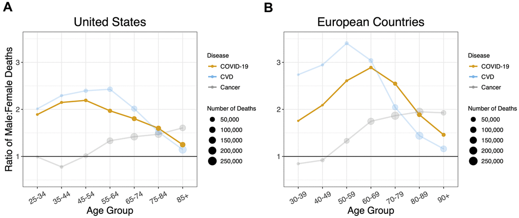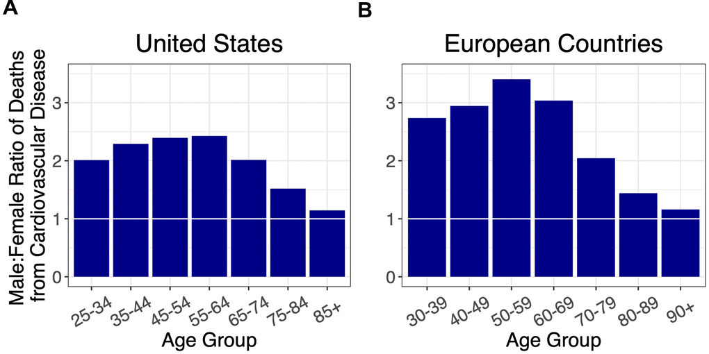 Additionally, the study does not account for nuanced differences in the overall similar patterns for COVID-19 and CVD in the United States versus Europe. The peak sex ratio for COVID-19 occurs at an earlier age in the United States than Europe, and the sex ratio for CVD mortality is higher for Europe than the United States until the older age groups. Finally, we could not rule out that the lower sex ratios in COVID-19 and CVD for the oldest age groups were partly due to selection, in that males who survive to an exceptionally old age are “escapers” who hardly represent the general population of older males; in contrast, females who survive to such an old age might be “delayers” who largely represent the general population of older females [36, 37].